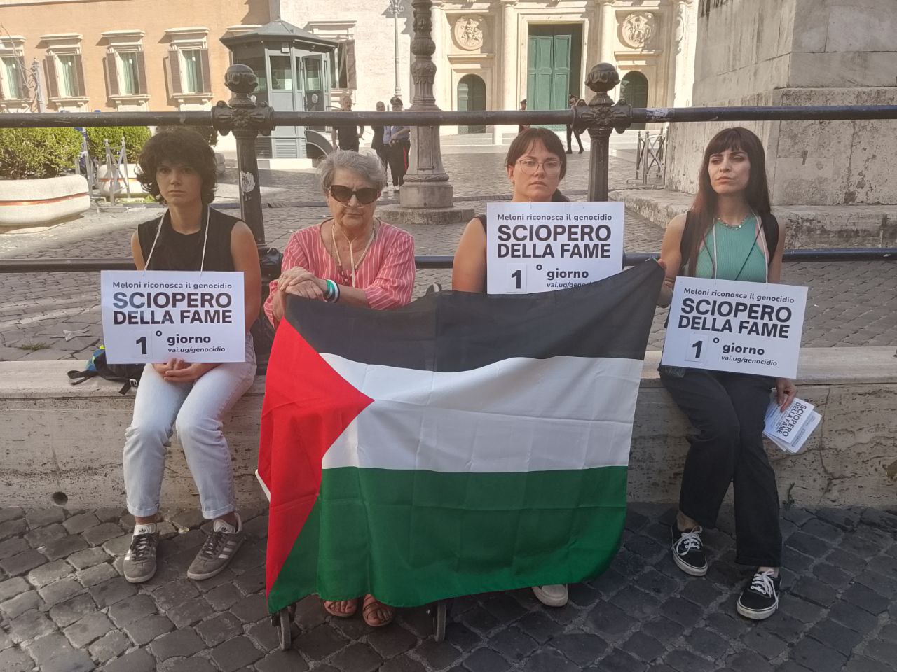 Roma, 20 settembre 2025 – Questa mattina tre persone supportate da Ultima Generazione – Beatrice (32 anni), Alina (36 anni) e Serena (39 anni) – hanno iniziato uno sciopero della fame a oltranza. Si sono presentate alle 9.45 davanti alla Camera dei Deputati in piazza di Montecitorio con una richiesta chiara: il Governo Meloni deve riconoscere ufficialmente il genocidio in corso in Palestina da parte di Israele e deve garantire protezione e ritorno in sicurezza per le persone italiane imbarcate nella Flotilla. Queste richieste sono in linea con quelle del grande sciopero nazionale del 22 settembre, a cui Ultima Generazione dà sostegno. Subito sono arrivate le forze dell’ordine che hanno sequestrato i cartelli delle tre persone con scritto “Meloni riconosca il genocidio. Sciopero della fame 1°giorno”, per poi restituirli.