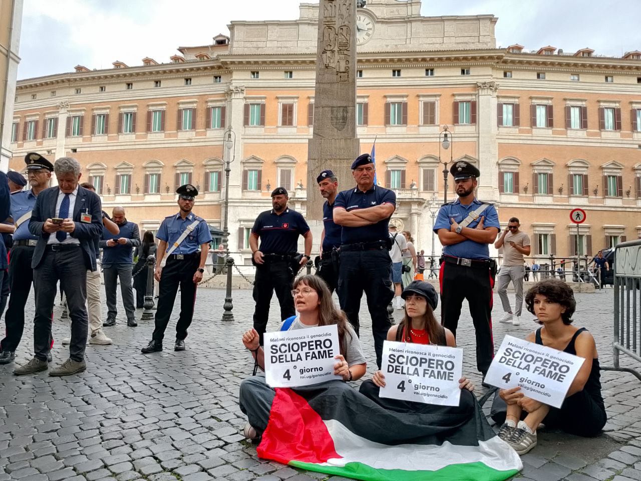 Roma, 23 settembre 2025 – Questa mattina intorno alle ore 11:00, Alina, Serena e Beatrice – al quarto giorno di sciopero della fame iniziato sabato – sono tornate a Piazza Montecitorio, davanti al Parlamento, con i propri cartelli chiedendo al Governo Meloni: il riconoscimento del genocidio in corso a Gaza e la protezione per le persone a bordo delle Flotille.